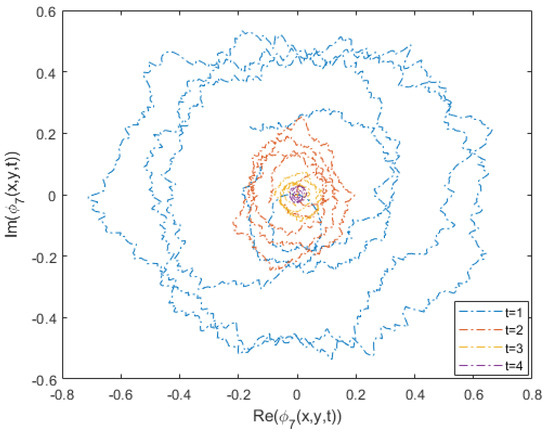 The rigorous randomness factor influences on structure, amplitude, band width, and soliton energy are given in Figure 1 and Figure 2. The ability of the abrupt wave collapse, which depends mainly on the impact of randomness, grows with increasing time t, as seen in Figure 2. At time , it was determined that the system almost totally collapses. When increases, we observe that the wave’s amplitude and width both shrink, and the wave starts to collapse, which is complete at , as shown in Figure 3. Also, the dark solution (18), which performs the dissipative pictures, was identified to be impacted by time t and the random variable , as illustrated in Figure 4, Figure 5 and Figure 6. The rate of collapse of the dissipative wave rises when t is increased, as shown in Figure 5. Additionally, as seen in Figure 6, the parameter induces the wave to collapse and convert into a distorted waveform with a limited amplitude.