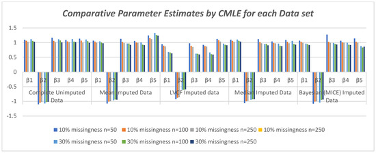 Undeniably, of all the classical imputation techniques, mean and median imputation do not introduce much undue bias into the data set, and therefore perform relatively better than the last value-carried-forward technique and mode of imputation. However, a model-based technique for imputation, like MICE, yields even better estimates, with even more reduced bias and precision [24]. Figure 1 shows the varying and reducing trends of the parameter estimates across the sample sizes and across imputation methods used in this study.