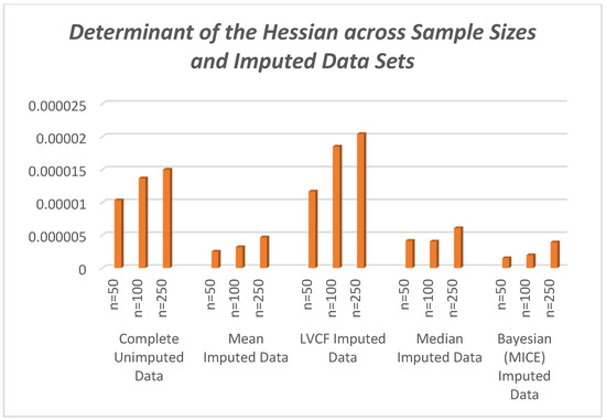 The present paper, therefore, aims to evaluate the susceptibility of the Hessian matrix to different imputation techniques by comparing the magnitudes of the determinants obtained from the Hessian matrix of the log-likelihood function with the imputed covariate vector.