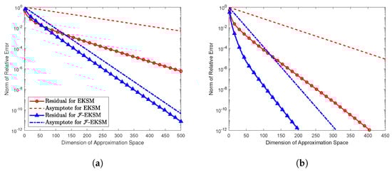 Though -EKSM is closely connected to EKSM, we emphasize that the convergence of -EKSM cannot be derived directly from that of EKSM applied to a shifted matrix. Admittedly, with the same vector b it is the case that -EKSM with a pole s applied to A and EKSM applied to both generate the same subspaces , however, the existing theory of EKSM [] can only provide a bound on the convergence factor for approximating , which is not what is needed and has no obvious relationship with the convergence for approximating from the same subspace. Our analysis is based on a special min–min optimization instead of the results of EKSM applied to a shifted matrix.