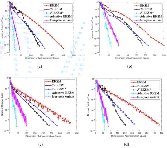 The points are called generalized Leja points [,]. In practice, we compute approximations with respect to the poles and zeros defined in (6) during the progress of iteration. Adaptive RKSM usually converges with fewer iterations than EKSM while using a smaller approximation subspace [,,]. While usually converging in fewer iterations than the variants with a few cyclic poles [], each step of adaptive RKSM requires a solution to a shifted linear system with a new shift, which is more expensive than using existing LU factorizations to solve the linear system with the same coefficient matrix that has been factorized. If the linear system at each RKSM step is solved by a direct method, adaptive RKSM tends to require longer runtimes than variants with a few cyclic poles based on reusing LU factorizations for each distinct pole. Adaptive RKSM is most competitive if the linear systems arising from each step need to be solved approximately by an iterative method and if effective preconditioning can be structured for each linear system with different shift.