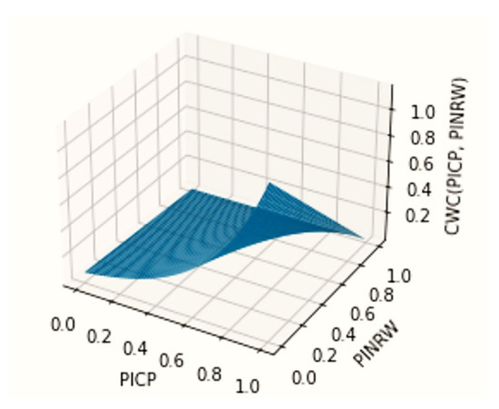 Figure 2 presents an example of a CWC surface for μ = 0.95 ,   η = 3 . It can be observed that the CWC function, being a functional combination of conflicting criteria (maximizing the number of points falling within an interval and minimizing the width of the interval), represents a compromise dependence expressed in the form of Equation (4). In other words, the CWC defines how much one can sacrifice the width of the interval in order to accommodate as many points as possible. It should be noted that there is a certain level in this task that is uncharacteristic for multi-criteria tasks, i.e., there exists a sufficiently large width of the interval that will assuredly encompass all points, and this interval value is finite (less than infinity). A specific issue with the CWC is that the function defined as Equation (4) is highly non-linear and complex, rendering the application of fast gradient back-propagation techniques irrelevant.
