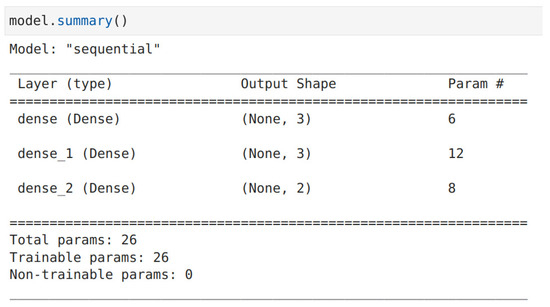 An ANN model was defined using the Tensorflow Sequential API. The ANN consisted of three dense layers with 3, 3, and 2 neurons each from input to output (Figure 4). Linear activation was used to transmit the signals between the layers. The ANN had a total of 26 parameters (Figure 5).