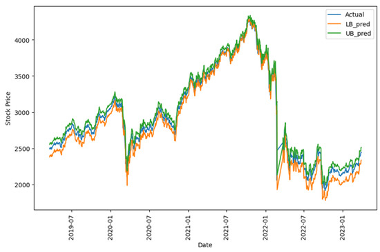 Figure 6. Model performance on test data. Here, Actual stands for actual point values of the closing price of the MOEX; LB_pred stands for Lower Bound of Prediction Interval; UB_pred stands for Upper Bound of Prediction Interval.