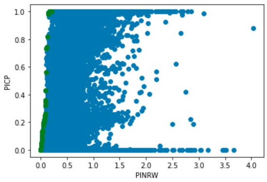 If what is needed is not a solution, but a compromise, which makes it possible to operate with the ratio of the PINRW and PICP criteria when making a decision, then a Pareto front can be constructed in the space of criteria. A Pareto compromise can be constructed for the final solution to the CWC optimization problem. Figure 7 shows the distribution of solutions during the PSO search according to their PICP and PINRW values. It should be noted that, due to the contradiction of the PICP and PINRW criteria, some other solutions on the boundary of the Pareto front could be selected depending on the goals of the modeling.