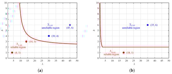 We obtain reliable regions of by (7). We plot the boundary of in Figure 1a, where the lower left is the reliable region and the upper right is the unreliable region , i.e., the complementary region of . From Theorem 1, we know that each pair of guarantees the local asymptotic stability of fixed point . Obviously, the pair of is in the reliable region , over which that all the solutions oscillate around with the increment of generations t and eventually converge to , as long as the initial value is in a neighborhood of . Also, we see that . On the other hand, we observe that the point is in the unreliable region , where all the solutions are divergent, regardless of whether the initial value is in a neighborhood of or not. We also mark that .