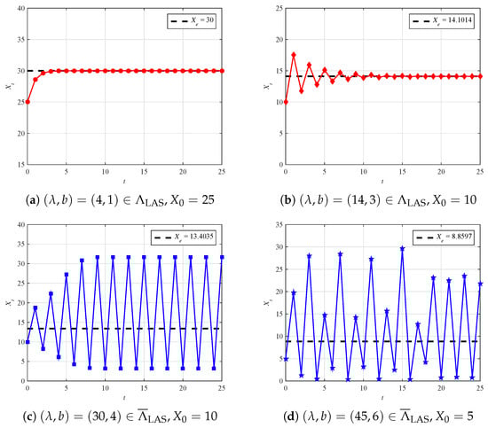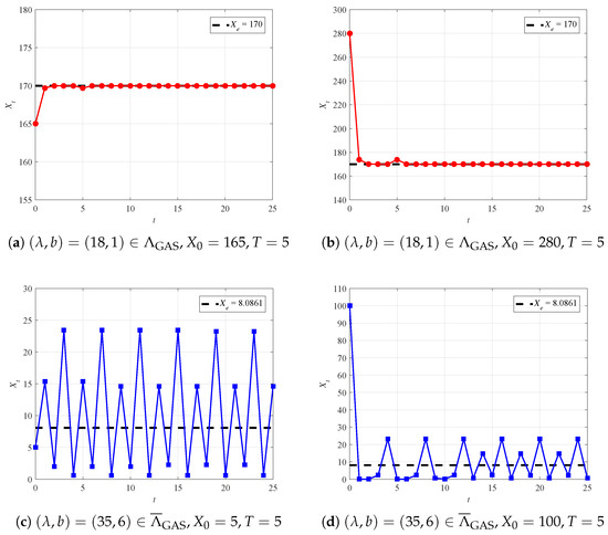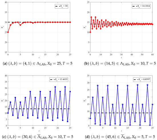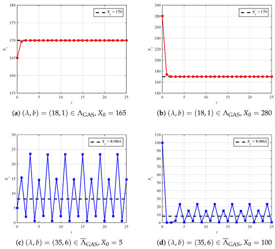 For comparison, for and , both in the unreliable region , the fixed points are and , respectively. Correspondingly, we also provide the dynamic behavior of in Figure 2c,d. From Figure 2c, it is easy to see that is periodic with Period 2 for . Figure 2d shows that is irregular for all t. These phenomena imply that is oscillatory and eventually divergent, in the sense that is unstable if , no matter how close is to .