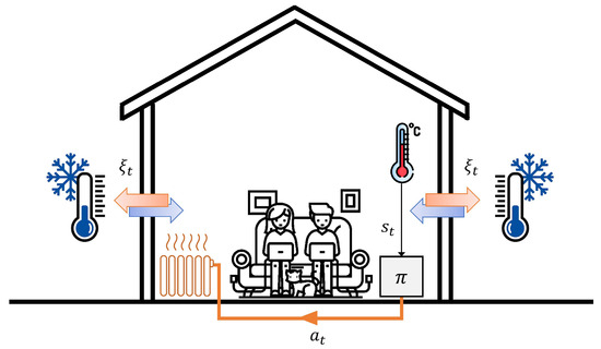 The first case study considered in this paper is the control of a house heating system, schematically represented in Figure 2. The uncertain component acting on the system is the outside temperature, which varies during the day: the higher the difference between the in-house and outside temperature, the higher the heat dissipation is (depending on the physical properties of the house’s walls). The control policy, , receives the current inner temperature, , as input, and sets the heater temperature, , for the next time.
