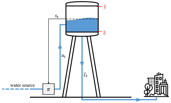 The second case study is the safe and optimal control of a water tank. The system is schematically depicted in Figure 5. The stochastic component affecting the system’s output is the water demand, , varying over time.