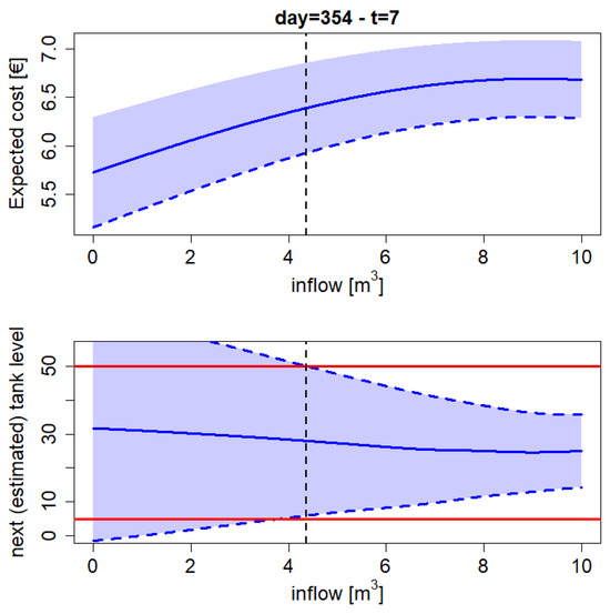 According to the definition of the input vector , it is easy to provide a graphical representation of how the approach works. Figure 7 provides an illustrative example for a specific day (i.e, the 354th in the dataset) and a specific hour of the day (i.e., ), in which is observed and unchangeable and, therefore, a one-dimensional representation can be easily obtained. The top of the figure shows the GP modelling the cost associated to any possible action: the solid blue line is the GP’s predictive mean, , while the dashed line represents the lower confidence bound (i.e., the objective function), that is . The shaded area represents the confidence interval; it is clear that the value of does not affect the minimizer. The bottom of the figure depicts the GP devoted to predicting , depending on the possible actions (while is always observed and kept fixed). The solid curve is the GP’s predictive mean, , and the dashed lines are the lower and the upper confidence bound, respectively, and . It is clear that the higher is, the smaller the estimated feasible (i.e., safety) region, directly affecting the location of the constrained minimizer.