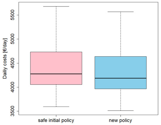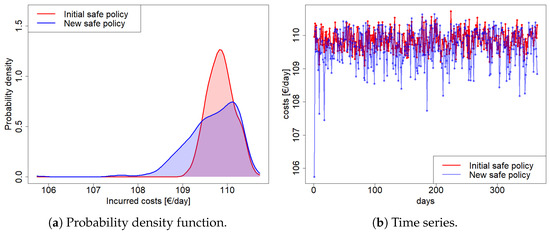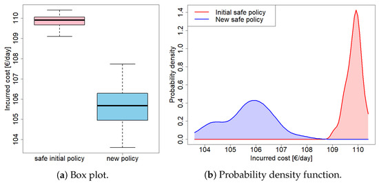 Figure 10 shows the statistically significant difference between the daily costs incurred by operating the safe-by-design policy (“safe initial policy”, in the chart) and those incurred by adopting the proposed approach (“new policy”, in the chart). The reduction in terms of daily costs is clear in both the two reported charts: a box plot (on the left) and two probability density functions (on the right).