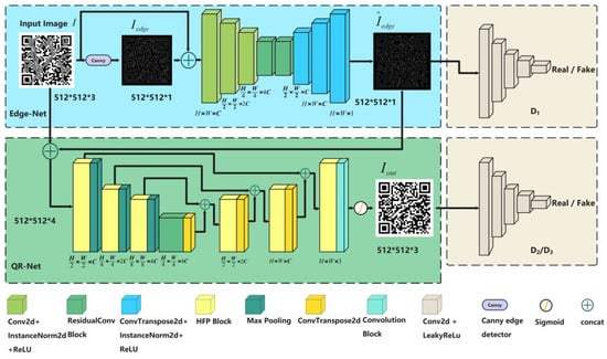 The objective of the edge reconstruction module is to predict and generate the repaired edge map based on the prior knowledge of the Canny edge map of the original QR code image. We first detect the edge information of the damaged QR code original image using the Canny edge detection, and then, we concatenate and along the channel dimension to form the input feature map of the module