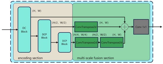 where X represents the input feature map of the HFP Block, and are the downsampled feature maps generated by the encoder at different layers, denotes channel concatenation, and ↑ indicates upsampling. Through upsampling and concatenation, the HFP Block combines multi-scale features.
