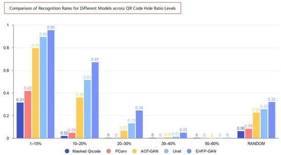 In comparison with other methods, the EHFP-GAN achieves the best performance in terms of recognition rate. As shown in Table 1, across different levels of the QR code hole ratio, the EHFP-GAN’s recognition rate surpasses that of the other models, reaching 95.35% within a 1–10% hole ratio range, which is significantly higher than Unet’s second-best result of 89.3%. Figure 3 presents a clear line chart illustrating the impact of increasing the hole ratio on QR code recognition rates for different models. Recognition rates for all models exhibit a declining trend, and as the hole ratio increases, the differences in recognition rates among the models become more pronounced. The EHFP-GAN model consistently maintains the highest recognition rates, demonstrating its superior robustness for damaged QR codes. Compared to other models, the EHFP-GAN achieves higher recognition rates at higher hole ratios, especially excelling under severe damage conditions. EHFP-GAN consistently exhibits the highest recognition accuracy across all hole ratio levels.