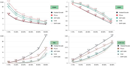 In terms of restored image quality, the EHFP-GAN outperforms the other methods in overall PSNR and SSIM indicators, indicating superior visual fidelity and structural similarity of the generated images. For instance, at a 10–20% hole ratio level, the EHFP-GAN achieves a PSNR of 23.103 and an SSIM of 0.966, both superior to Pconv (PSNR 20.226, SSIM 0.948) and the AOT-GAN (PSNR 17.882, SSIM 0.951). From the perspective of FID, our model performs optimally in the 1–40% range, while in other cases, it maintains a high level of performance, although not the best. Concerning the L1 metric, Unet performs better under high hole ratio conditions, whereas the EHFP-GAN shines under low hole ratio conditions. For instance, at a 1–10% hole ratio level, the EHFP-GAN’s L1 of 0.005 is lower than that of Unet (0.007) and AOT-GAN (0.009). Figure 4 visually demonstrates that as the QR code hole ratio increases, the PSNR and SSIM values for all models gradually decrease, while the FID and L1 values increase. However, it is worth noting that the EHFP-GAN consistently delivers a top-tier performance across these metrics, especially in the 1–40% hole ratio range. In the range of 40–60%, certain metrics may not attain their peak performance, but they typically reach a level close to optimal. This underscores EHFP-GAN’s exceptional ability to generate high-quality images, particularly under conditions of low hole ratios. In the case of hole ratios ranging from 50% to 60%, several metrics, such as SSIM, PSNR, L1, and more, as depicted in Figure 4, clearly demonstrate a tight clustering of results for all models within a remarkably limited range. This phenomenon arises due to the substantial occlusion experienced by QR code images in this range, resulting in generally suboptimal performance across these models when it comes to recovering images with such elevated levels of obstruction.