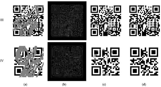 To validate the robustness of the EHFP-GAN model under different hole ratios, we compared its image restoration effects at four different ratios of (1) 1–10%, (2) 10–20%, (3) 20–30%, and (4) 30–40% (as shown in rows I–IV of Figure 6). The experimental results show that due to the blank borders around QR code images, the actual information content damage is more severe than the direct image damage level. Under low hole ratios, the model can restore QR code edges relatively well. But as the ratio increases, the edge restoration quality gradually decreases, and the images become blurred to some extent. Nevertheless, the restored QR codes at different hole ratios can all be successfully recognized. This result proves the robust restoration capability of the EHFP-GAN model for damaged QR code images.
