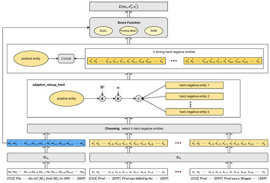 To date, a body of work [9,10,11,12,13] has emerged on zero-shot EL, most of which uses BERT [14] as the base encoder. These research efforts have mainly focused on the candidate generation phase, which has a crucial impact on the candidate ranking in EL systems. Ref. [11] was based on encoding mentions and entities using a Biencoder [9] architecture, followed by a Sum-Of-Max (SOM) score function, to compute the similarity between them and training the model using either hard negative sampling or mixed-p negative sampling. Ref. [13] proposed a Transformational Biencoder, which introduced a transformation into the Biencoder to encode mentions and entities and adopted an In-Domain negative sampling strategy, in which they sorted all entities in the golden entity domain over a training period to take the top-k entities as hard negatives.