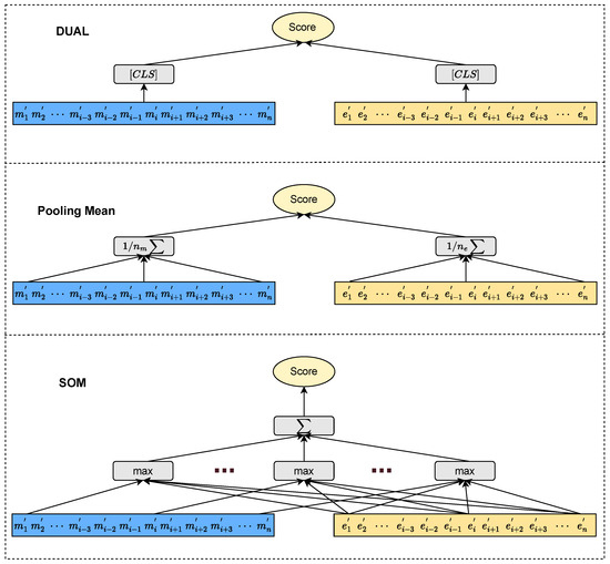 In addition, Ref. [11] followed the architecture of [9] and presented that the SOM scorer [23] produces better results than DUAL. However, it is worth noting that the SOM scorer comes at the cost of increased computational cost due to considering all hidden states of and in the scorer. It means that SOM takes more time than DUAL and Pooling Mean in the training and prediction phases. SOM computes as follows.