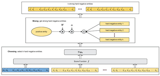Choosing: For the mention–entity pairs in a batch, they are encoded into vectors . Then, for each mention m in a batch, there is one positive entity and the rest are its corresponding negative entities . Next, we use the scoring function f to compute the scores of the mentions with their corresponding negative entities. According to hard negative sampling, we select the top k highest scores among the negative entities as the hard negative entities . The hard negative entities are computed as: