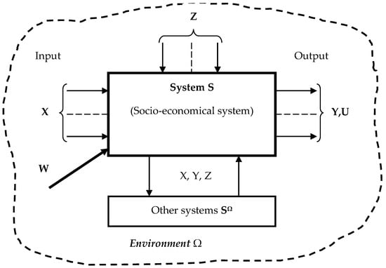 When modeling a complex socioeconomic system, we proceed from its representation in the form of a diagram (Figure 1). Note that when developing a cognitive model of a complex system, its feature is that it necessarily includes parameters not only of the system itself but also of its environment.