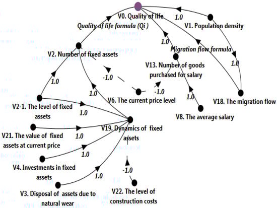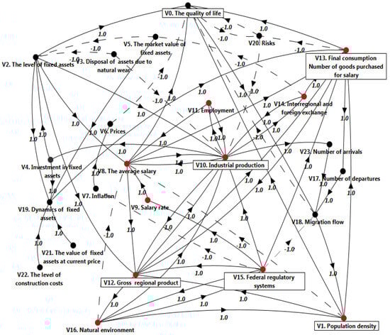 The development of a regional socioeconomic system cognitive map in the research was based on the scheme of the regional economic mechanism [], statistical quantitative data of indicators of the socioeconomic, industrial–technological, and environmental block for assessing the state of the region [], some of which are given above. The parameters of the life quality equation reflect the functional relationship between some vertices of the cognitive model (Figure 2).