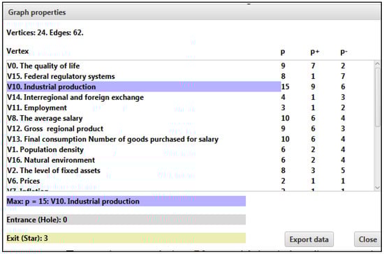 In the cognitive modeling process, the graph properties was studied, including its paths and cycles, complexity, connectivity, and stability analysis. Let us present a number of results of these studies. Figure 4 shows a fragment of data on the valence of vertices (by the number of arcs entering and leaving the vertices) of the studied cognitive map G.