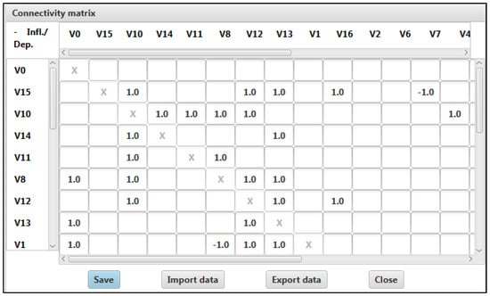 Cognitive modeling enables the study of the influence of factors in complex semi-structured systems, imitating their progress and predicting the chain of events within the system and its relationship with the external environment. The methodology of cognitive modeling was first proposed to support the decision-making process in semi-structured systems []. The possibilities and advantages of the cognitive approach are now clearly presented [,,,]. Complex socioeconomic systems have been successfully evaluated as cognitive models for various applied problem solutions; this method is widely applied in many spheres of human life, science, and education [,,]. Researchers use the cognitive approach and applications of cognitive mapping for decision making and project management in various broad areas and complexly structured systems [,,]. There is a certain author’s experience in cognitive modeling of complex semi-structured systems [,,,,].