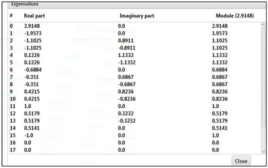 To determine the resistance to disturbances (the fourth criterion), the well-known Nyquist criterion in control theory [,,,] was applied to study the stability of a cognitive map. According to this criterion, the maximum root of the characteristic equation of the matrix RG should not exceed 1 in absolute value. Figure 6 shows the results of calculating the roots of the equation.