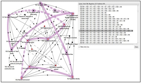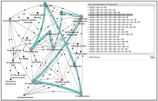 The conclusion about the structural stability of the system on the simulation model is made after the analysis of the cycles of the graph—the cognitive model. A criterion of structural stability is used in the analysis of cognitive maps [,,,]; a system model is considered structurally stable if it contains an odd number of negative (stabilizing) feedback loops. Figure 7 and Figure 8 show the analysis of the cognitive model G results cycles.