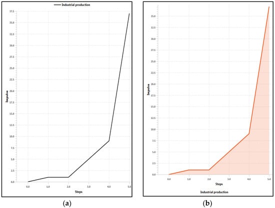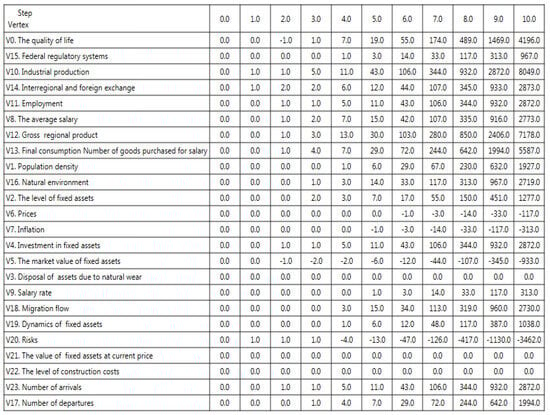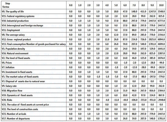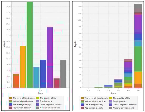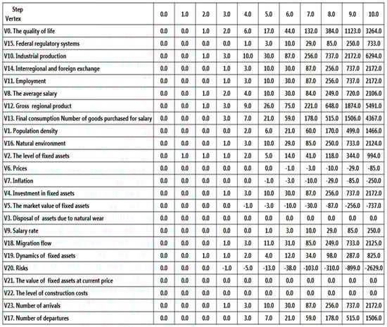 What will happen if production begins to develop in the region? The model control impulse q10 = + 1 is introduced into the V10 industrial production vertex: impact vector Q1 = {q1 = 0;… q10 = +1; …q23 = 0}. Figure 9 shows the setting of the initiating impulse simulation q10= + 1 to the vertex V10, which is highlighted in Figure 10 by the color, frame, and size of the circle. The results of impulse simulation in CMCS [] are presented in Figure 10, Figure 11, Figure 12, Figure 13, Figure 14, Figure 15 and Figure 16. Graphs of impulse processes are built according to the data in Figure 10. Due to the conditions of visualization of the trends presentation in the development of processes, the graphs shown reflect the results of 5 modeling steps. Figure 11 highlights the graph of changes in impulses only along the top of V10, into which a control impulse is introduced; in Figure 11a, the graph is shown by a line; in Figure 11b, the graph is in the form of an area characterizing the “volume” of the phenomenon.