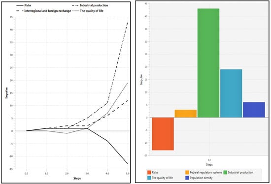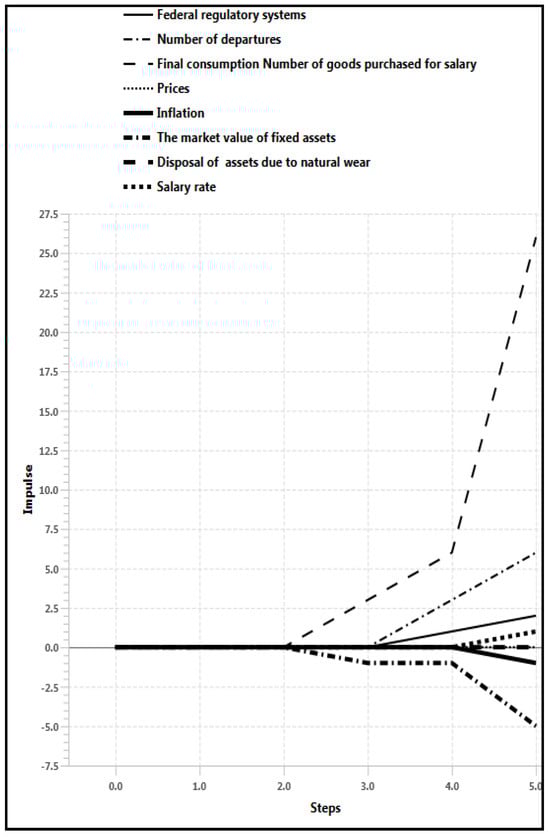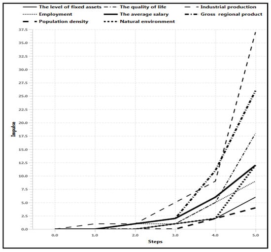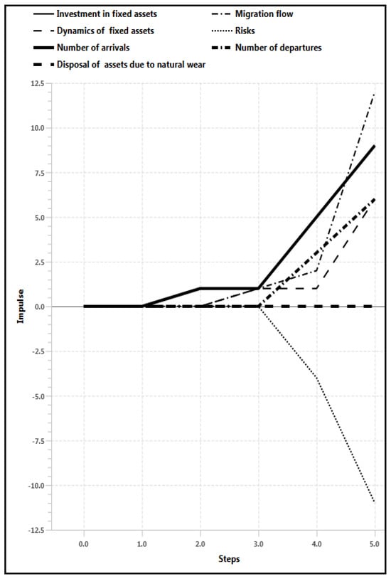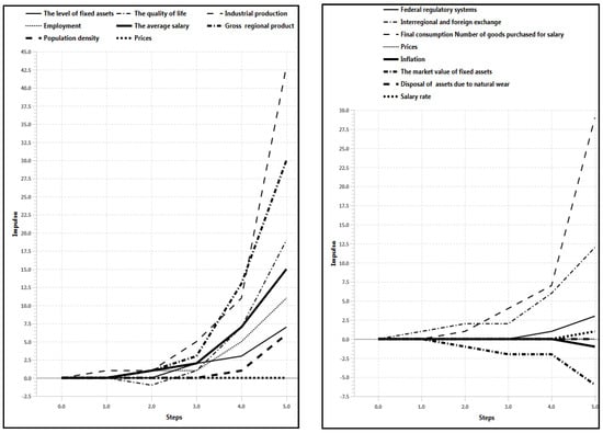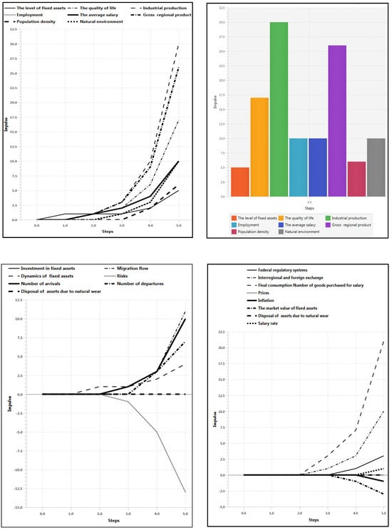 Analyzing the graphs in Figure 21, we see that despite the growth of risks up to the third cycle of modeling, their negative impact can be overcome through purposeful, reasonable actions of federal regulatory systems and the development of production. So, after the drop in the first cycles of modeling the impulse at the top quality of life, after the third cycle, the trend of changes in the top becomes positive and increases. This effect is achieved due to the rapidly growing positive trend in the development of production.