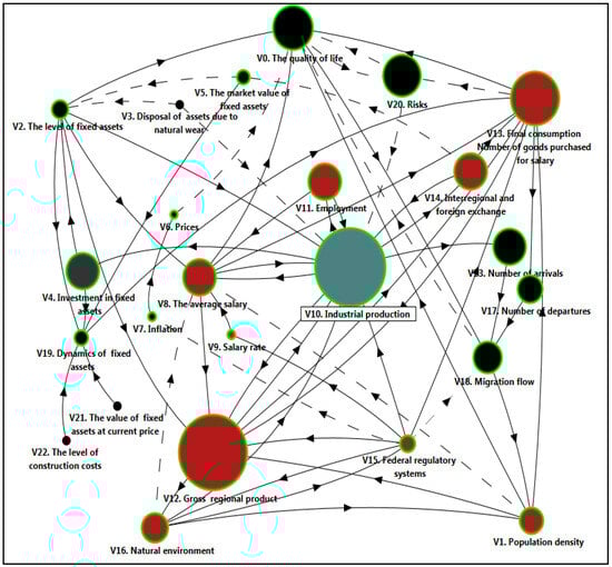 As seen in Figure 4, the V10 industrial production vertex (highlighted) has the largest number of arcs so that we can judge its special importance for the system. Changes in it can immediately affect 15 elements (Figure 5) of the system, and one can expect that management actions aimed at developing regional production can provide the greatest effect on the regional system.
