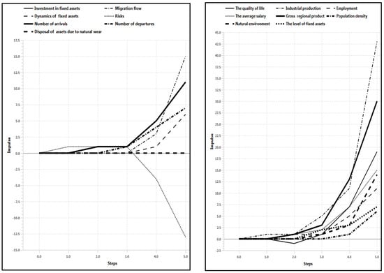 Let us assume that risks are growing in the regional system, q20 = +1, but they are opposed by the development of production, q10 = + 1, and the growth of interregional and foreign economic exchange, q14 = +1; impact vector: Q1 = {q1 = 0;… q10 = +1; …q14 = +1;…q20 = +1; …q23 = 0}. Graphs of impulse processes are constructed according to the data in Figure 20. The results of impulse simulation in CMCS [] are presented in Figure 21 and Figure 22.