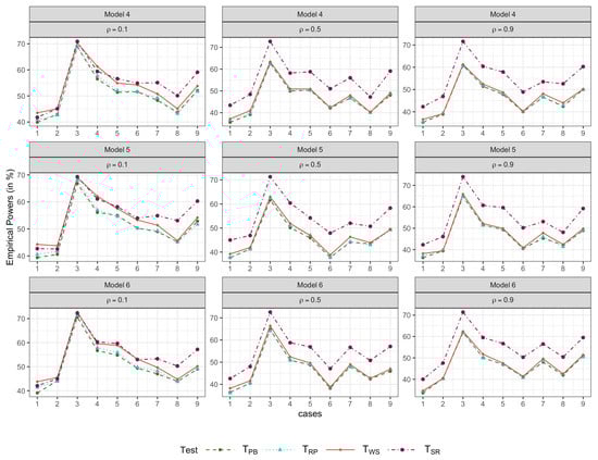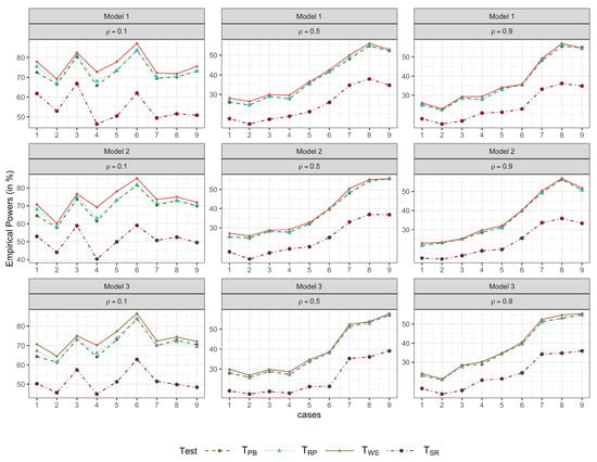 Figure 2 presents the empirical powers of all four tests based on Models 4–6, offering several noteworthy insights. First, it is evident that , , and demonstrate similar empirical powers. This implies that these three tests exhibit comparable performance regardless of whether the generated data follow a normal or non-normal distribution. Second, it is also observed that under similar settings, the empirical powers of the tests generally increase with larger sample sizes. Lastly, when takes on values of 0.5 and 0.9, the empirical powers of surpass those of the other three tests. However, when , the empirical powers of all four tests are generally comparable. This indicates that, in the scenarios under consideration, demonstrates greater effectiveness compared to the other three tests when the correlation coefficient is relatively high.