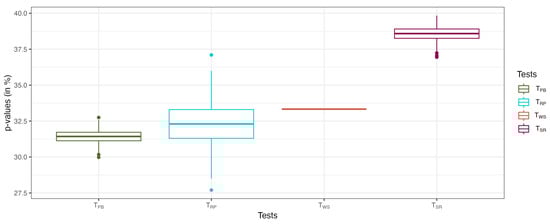 Notice that the test is bootstrap-based and the tests and are permutation-based. This means that their p-values are obtained via bootstrapping or permutating numerous random samples to compute the associated p-values as described in Section 3.1 and Section 3.2. Thus, the p-values of these tests are random, i.e., they are different at different instances. However, the p-value of remains fixed. In order to investigate this clearly, we performed 500 iterations of , and on the case “NOR vs. UNI vs. SUS”. The boxplots of the corresponding p-values of the four tests are presented in Figure 3. It is evident that the p-values obtained from remain fixed, whereas those derived from , and exhibit variability. This contrast underscores the fact that p-values resulting from bootstrap-based or permutation-based tests indeed differ across various instances.