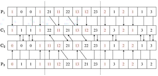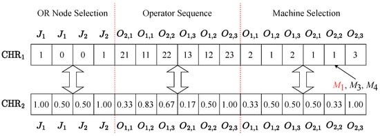 The type-2 IPPS contains two subproblems, process planning and shop scheduling, where the shop scheduling part can be regarded as a flexible job–shop scheduling problem (FJSP). For this subproblem, this paper uses the two-part coding scheme, which is commonly used by FJSP [21]; it encodes operation sequencing and machine selection with OS strings and MS strings, respectively. Unlike FJSP, the operation number cannot be represented by the number of occurrences of the job number in the OS string because of the uncertainty of the operation order in the type-2 IPPS problem, so two integers are used to represent an operation in OS, and they represent the job number and the operation number, respectively. For the process planning subproblem, this paper deals with the operation selection problem in the encoding process, and the encoding indicates the values of each OR node of the job from left to right; for the operation ordering problem of the same job, it is dealt with in the decoding. In summary, the particle coding consists of three parts, namely operation ordering, machine selection, and OR node selection, and the coding length is , where denote the number of operations and OR nodes of , respectively, and Figure 2 is an example of coding.
