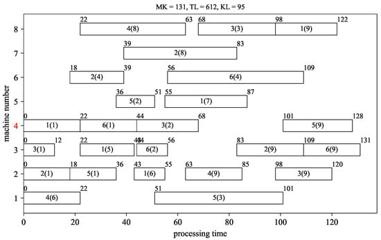 - Makespan (MK): The makespan indicates the completion time of the last job to leave the machining system, reflects the efficiency of machine utilization, and is the most widely used evaluation indicator in scheduling problems.