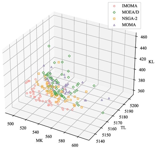 The scheduling decision schemes for each case are given in Table 5. From the table, it can be seen that the IMOMA algorithm is able to generate relatively better solutions, although some solutions do not dominate each other. It can be seen that the results obtained by IMOMA are able to achieve better results in more than two objectives compared to other algorithms. As in the case Kim24, the scheduling solution obtained by IMOMA computation can dominate the results of the NSGA-2 algorithm, and for MOEA/D and MOMA algorithms, the results of the IMOMA algorithm are more advantageous in the optimization of MK.