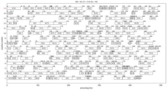 - Generate feasible scheduling. According to the operation sequencing part of the code, the processing order and start time of each operation on the corresponding machine are obtained. In this paper, we use the greedy interpolation method [21] to shorten the processing time of the job, i.e., we traverse all the free time windows of that machine during the decoding process and assign the process to the time window that can be processed earlier.