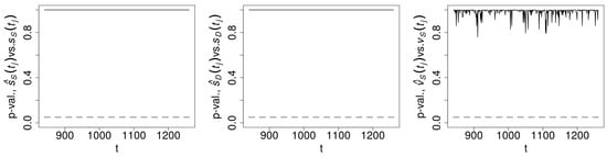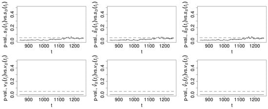 Then, we used the test to compare the predicted and the underlying processes. The p-values of the test on the null of distribution equality over the entire time domain are presented in Figure 3 and Figure 4, where the dashed lines indicate the significance level. As depicted in the two plots from the first column of Figure 3, the true return and volatility underlying processes generated from the SV and DV models exhibited significantly disparate distributions at almost every fixed observation time . The second and third columns of Figure 3 suggest that the null hypothesis of distribution equality was rejected when the underlying processes showed significant differences in the cross-comparison, while the FDA forecast shared the same distribution as its true underlying process at almost every , as evident in Figure 4. The results imply that the one-step-ahead rolling forecast using the FDA-based method could preserve the distributions of the true underlying processes pointwisely and could distinguish the true underlying processes from a falsely assumed continuous-time limit in terms of their distributions.