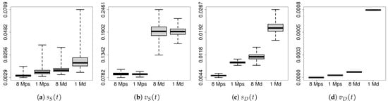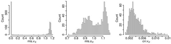 This section presents detailed information on the 420 rolling-window estimates. Figure A14, Figure A15, Figure A16, Figure A17 and Figure A18 present the estimation results for each parameter. The three consecutive plots, from left to right, illustrate the distribution of the estimated values eliminating the 2.5% tail on each side to avoid plot distortion due to extreme values, the estimation bias, and the rejection rate, respectively. Within each plot, the label “SS” corresponds to the utilization of the SV model for estimating SV underlying processes, “SD” corresponds to the employment of the SV model for DV underlying process estimation, “DD” corresponds the use of the DV model for estimating DV underlying processes, and “DS” corresponds to the use of the DV model for SV underlying process estimation. These figures suggest that MLE offered dependable estimations under accurate specifications. However, its performance lacked consistency when the underlying process was misspecified.