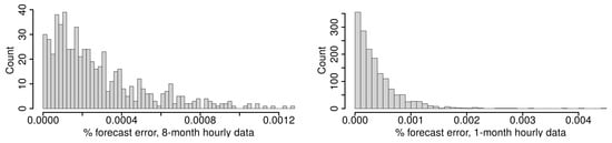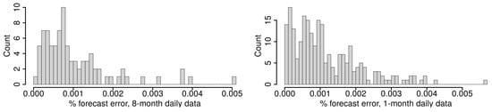 Figure 7 and Figure 8 depict the functional predictions across various sampling frequencies and rolling windows. Figure 9 and Figure 10 present the distribution of the ratio of absolute forecast errors to log-returns in the four corresponding scenarios. The percentage of the forecast errors was consistently small, suggesting a close alignment between the forecast and the actual log-returns, which underscored the robustness and reliability of the proposed FDA-based method.
