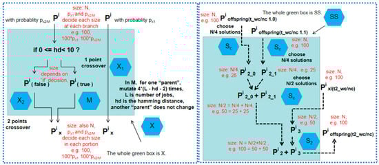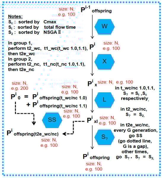 W-X-L deploys a special operator to choose the parents (W), a crossover (X) operator, and a local search (L) operator. It is worth mentioning that the family of tasks above shares the same initial (I) population (random) for a fair comparison. The phase of selection (S) differs. For S, we use NSGAII, some sorting methods using the Cmax objective or TFT objective, and so on. Therefore, many shared parts above from both problem and algorithm sides are elaborately constituted towards a harmony test bed for a well-defined SMO (Figure 2, Figure 3 and Figure 4).