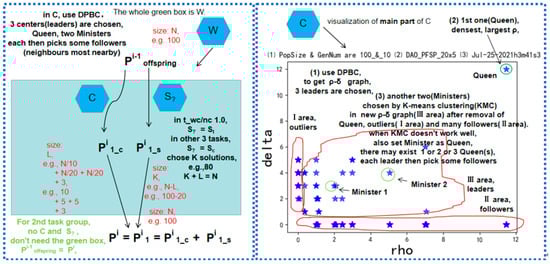The details of W and C are as listed above. Here, we choose the parents Pi. DPBC is in C. You can see a typical ρ-δ(rho-delta) graph in the simulation, where ρ denotes the local density and δ denotes “the minimum distance between one sample point and any other one with higher density” []. Each star is an individual or a solution to solve PFSP in SMO, and 3 red lines characterize 3 areas in the solution space.
