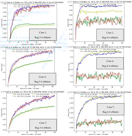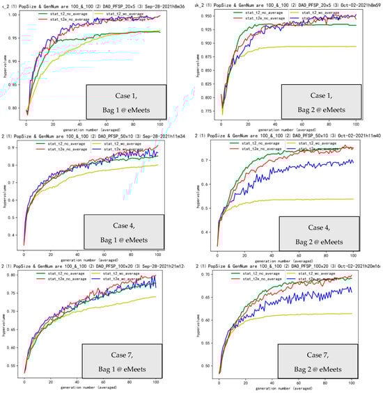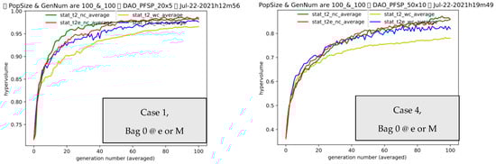 Cases 1 and 4 in Bag 0 are shown above, respectively. We choose representative data of Cases 1 and 4 to save space. “e or M” means eMeets or Meets. Notes: (1) “stat” means statistics of hypervolume. (2) Actually, t2_nc is the baseline NSGAII without both clustering and transferring.