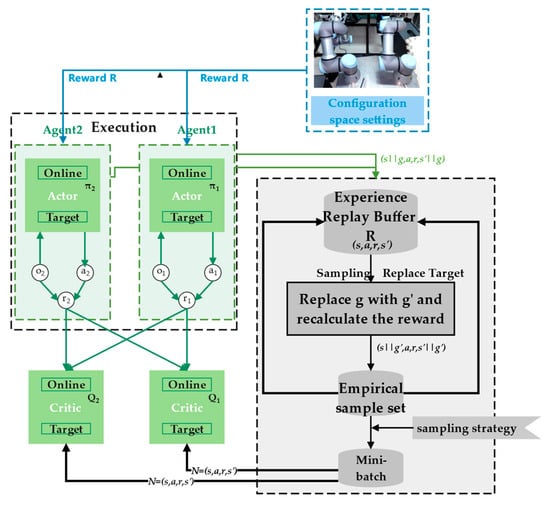 In this section, to design a path planning algorithm for a dual-arm robot based on MADDPG, we modeled the reinforcement learning problem as an MDP (Markov decision process) and used the HER (hindsight experience replay) algorithm to improve reward sparsity in MADDPG, thereby enhancing training efficiency and algorithm stability. Additionally, we expanded the configuration space of the dual-arm robot. In the given collaborative task, the dual-arm robot needs to learn how to cooperate and accomplish the task through a series of actions. This involves two agents controlling the robot in a non-deterministic environment with a continuous action space. During the training process, the strategies of each agent will evolve. The intelligent agents need to adapt to the environmental states and coordinate their action policies with other agents. Figure 1 is the overall framework diagram of our algorithm. Upon the completion of each transition, it is customary to enqueue said transition into a designated queue referred to as the “Replay Buffer.” The capacity of this replay buffer is determined by a hyperparameter denoted as “n”, allowing it to store a maximum of n distinct transitions. In the event that the replay buffer reaches its full capacity, any newly incoming transition will replace the oldest existing transition within the buffer. The update process for both the actor and critic is carried out by uniformly sampling a minibatch of data from this buffer.