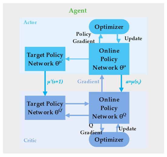 During the forward pass of computing their individual actor networks, each intelligent agent only utilizes its own local observation vector as the input to the online actor network, which outputs a deterministic action i, denoted as . Subsequently, following the same procedure as DDPG, the mean squared error (MSE) loss function for temporal difference errors is computed, and gradients with respect to parameter are calculated. These gradients are then utilized for parameter updates using gradient descent.