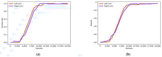 Illustrated in Figure 3a, the primary objective of the initial experiment was to position the end effectors of the robotic arms at the designated location of a blue target object. The diagram delineates the workspace of the left arm through white lines, while the workspace of the right arm is enclosed by green lines. Both workspaces are equally sized and exhibit areas of overlap, giving rise to a shared space at their intersection. When the target object resides within this shared space, both end effectors are capable of reaching the target’s position. However, if the target object occupies the exclusive space of either arm, only the arm associated with that region can access the target’s location. Figure 3b visually portrays the trajectory of paths traced during the training phase. In each episode, both arms are tasked with determining the shortest route from their individual starting points to the respective target positions. The success rates of the left and right arms reaching the target object’s position are depicted by the purple and red lines in Figure 4a. Notably, with increasing numbers of training iterations, the success rates progressively improve, ultimately leading to minimal instances of failure. These outcomes underscore the favorable performance exhibited by the PPDDPG algorithm in the domain of dual-arm robot path planning.