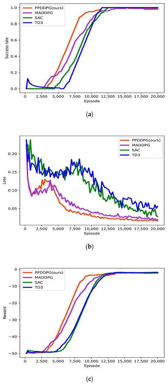 It is evident from the depicted results that both our enhanced algorithm and the MADDPG algorithm exhibit expedited convergence with respect to success rate and critic loss. The underlying rationale lies in the fact that both the proposed algorithm and the MADDPG algorithm are meticulously tailored for multi-agent systems, where each agent is equipped with an individualized policy network and action-value function network. When contrasted with alternative algorithms, these two methodologies emerge as particularly suited for tasks requiring multi-agent cooperation. They effectively optimize policies and value functions, consequently manifesting enhanced convergence and performance within the context of path planning.