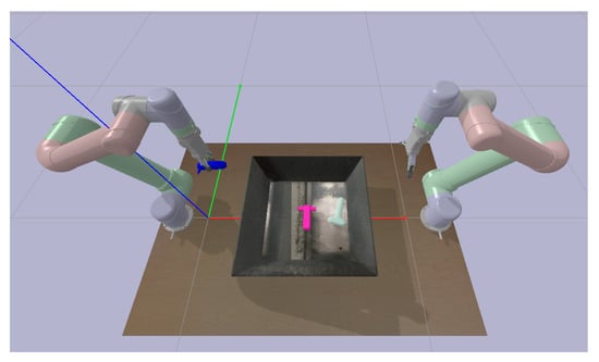 To implement the proposed PPDDPG algorithm, we employed two five-degree-of-freedom robotic arms. We created and simulated the environment for the dual-arm robot using the gym and pybullet toolkits [,]. The training process of the algorithm was conducted within the simulation environment. During the experiments, we conducted multiple tasks to evaluate the algorithm’s performance. During the training process, we utilized the Nvidia GeForce RTX 2080Ti GPU and Intel i9-13900 k CPU. The entire training process took approximately 18 h.